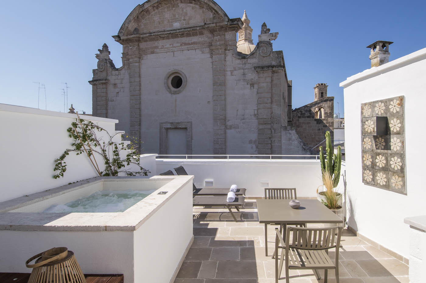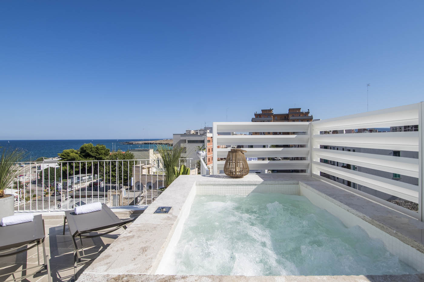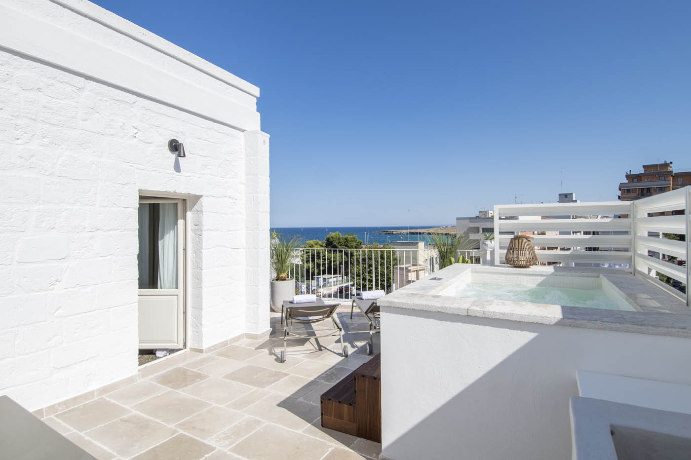 Al quarto piano del palazzo, le camere Superior offrono un’esperienza unica: una terrazza privata con vasca idromassaggio e solarium per momenti di puro incanto.